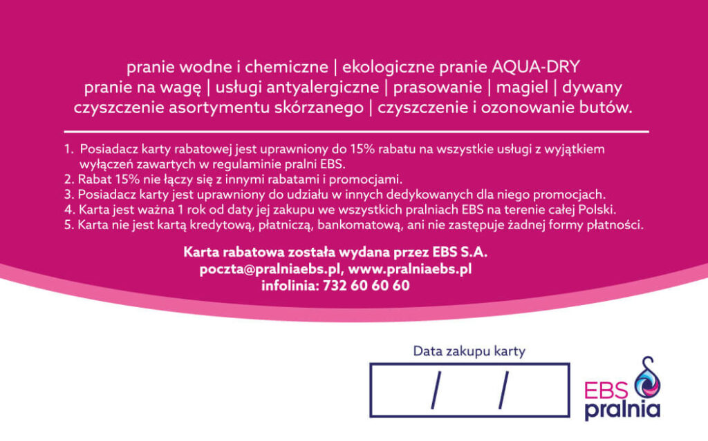 Chcesz korzystać z tańszego prania? Kup Kartę EBS. Z nią otrzymasz dedykowane specjalnie dla Ciebie zniżki i rabaty przez cały rok.